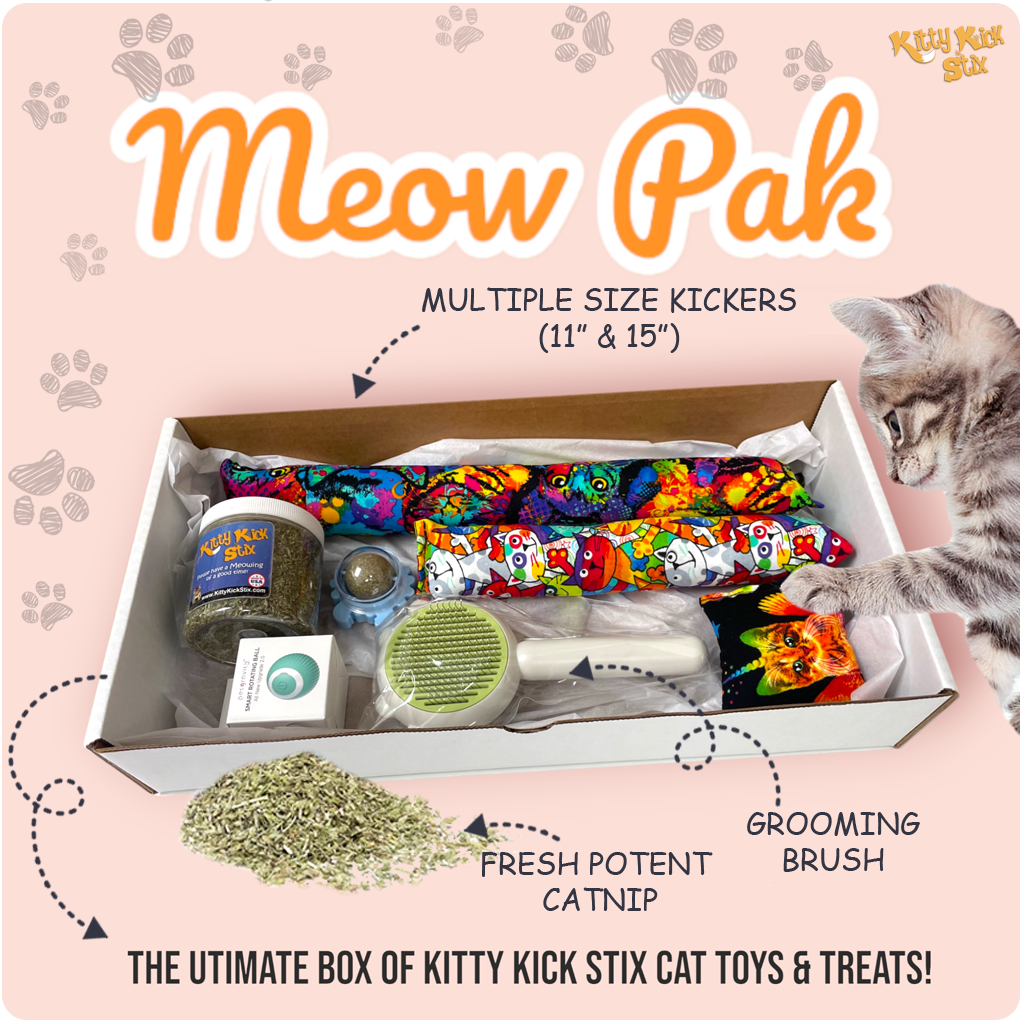 The Meow Pak by Kitty Kick Stix includes the best selection of our most popular toys made with premium quality catnip, plus unique items designed to keep your cat happy, healthy, and fit.